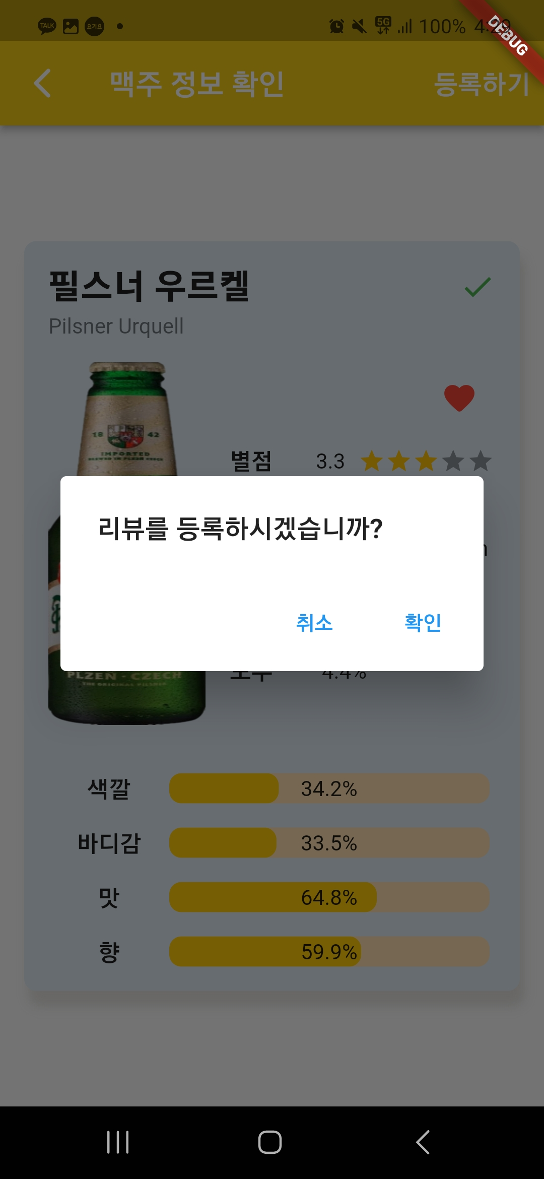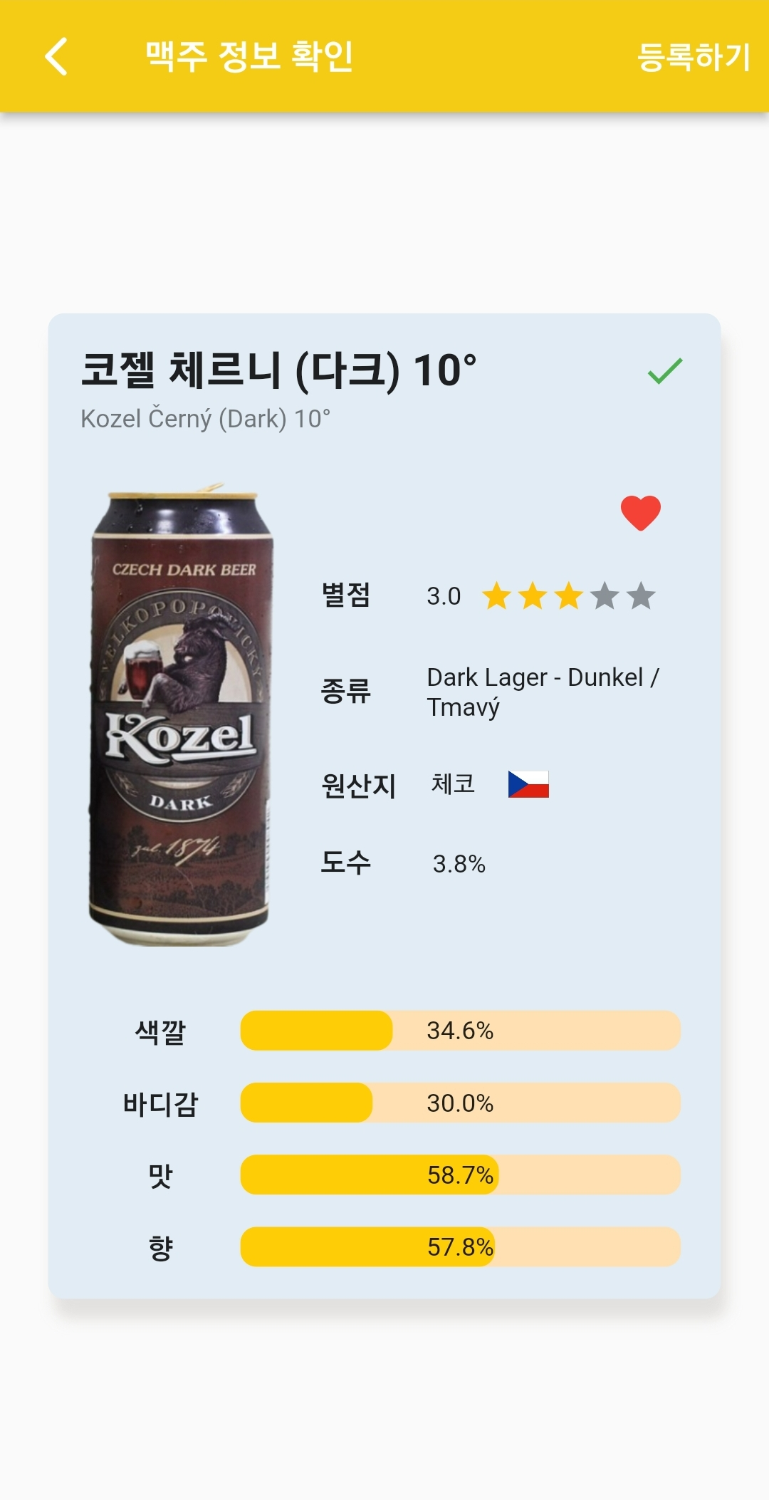 - 해당 맥주의 색깔, 바디감, 맛, 향이 표시되며 사용자들이 남긴 리뷰의 평균치로 표시된다.
