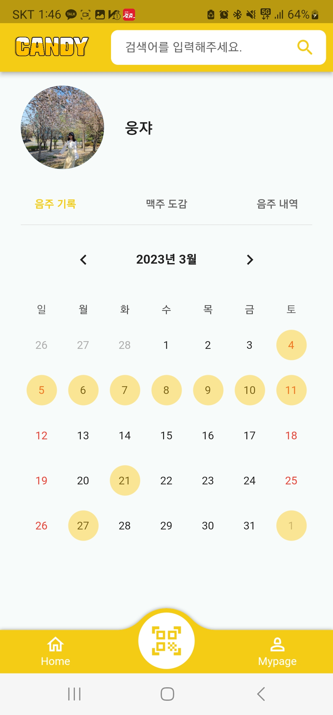- 맥주를 인증한 날에는 음주 기록 달력에서 노란색상으로 날짜에 표시된다.