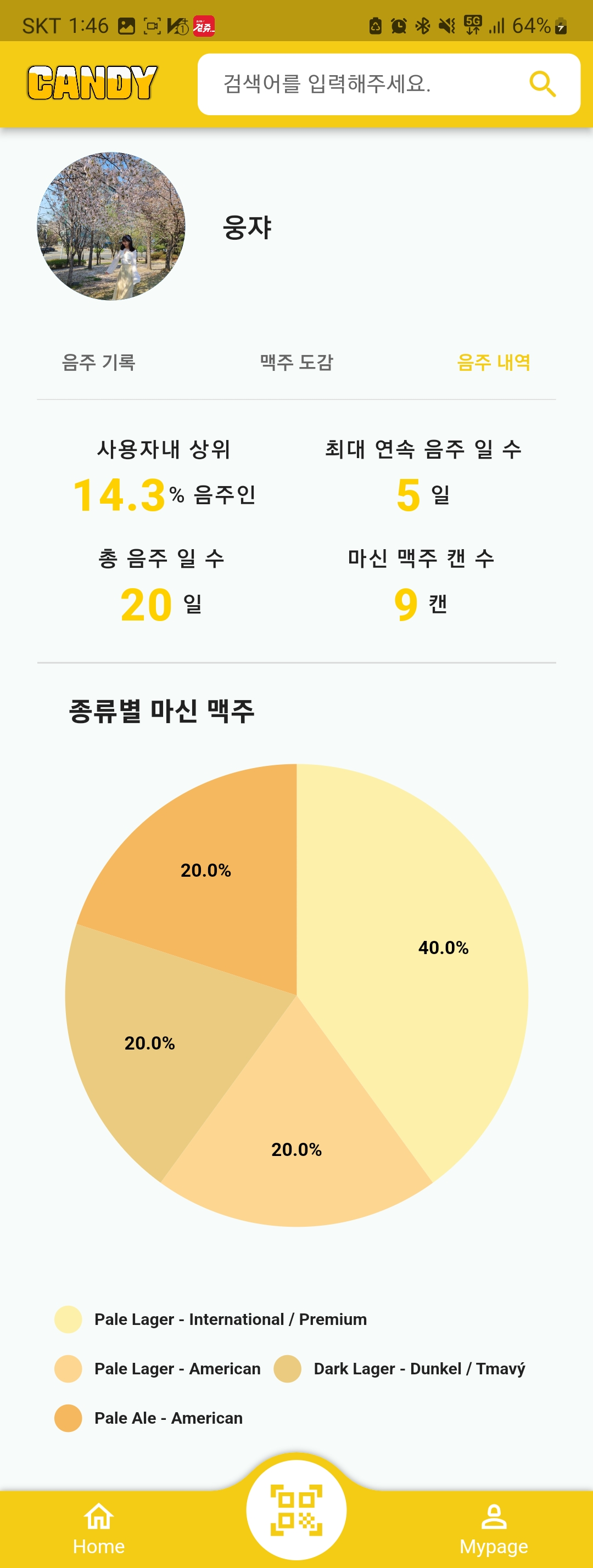 - 음주 내역에는 음주 일 수, 연속 음주 일 수, 총 마신 캔 수, 상위 몇 퍼센트 애주가인지 나오게된다.