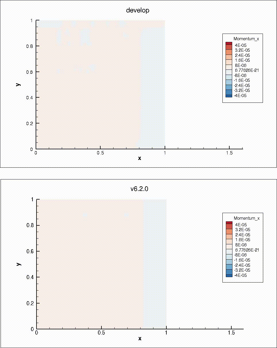 To verify the problem, I looked at the "navierstokes/poiseuille" test case. This case is homogeneous in the y direction, and has periodic boundaries. Instead of treating it as a steady-state problem, I did time-marching wit simple time-stepping. I then compared the results with the same simulation on v6.2.0 (before PR #652 changed the periodic boundaries). The y-momentum is very similar in both cases. However, the x-momentum shows inhomogeneity on the develop branch: