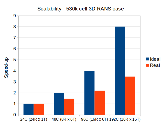 It may not look like much close to the ideal scaling but on 192 cores there are only 2.7k cells per core, and at different level of "hybridisation" this is what you get: