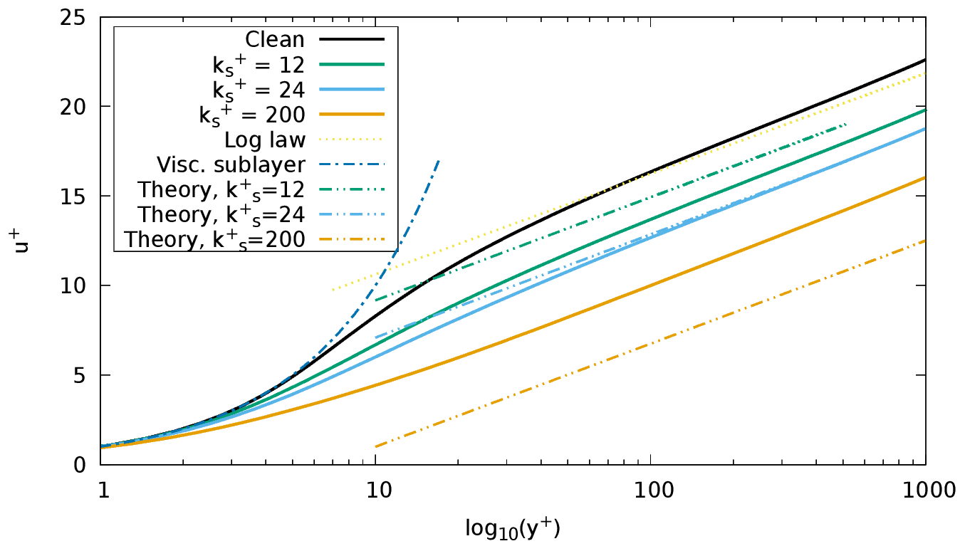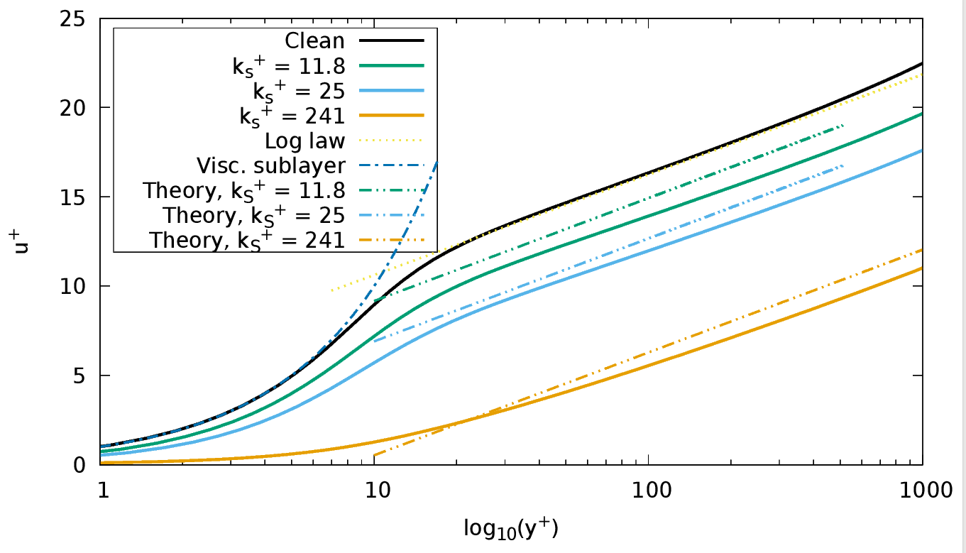 Here I am plotting the non-dimensionalised velocity u^+ against y^+. The clean results give fairly good agreement and we can see some over prediction in velocity shifts. This was also reported elsewhere