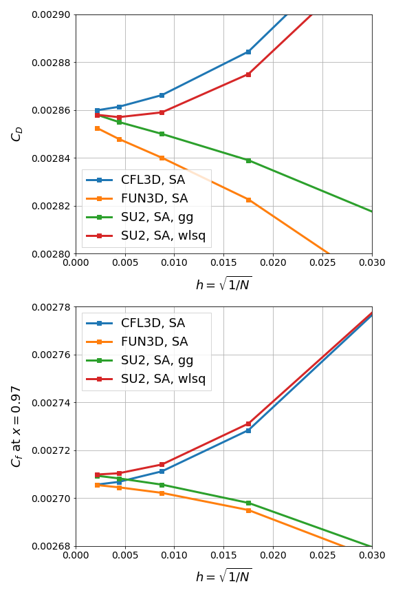 Hmm.. you are right that the Cf results look a little different than the ones posted on the V&V page (for both SA and SST). Is there anything else different in the configuration for those cases from the set up for the cases on the V&V page? For the flat plate, I may have used unweighted LSQ for the posted V&V results. |