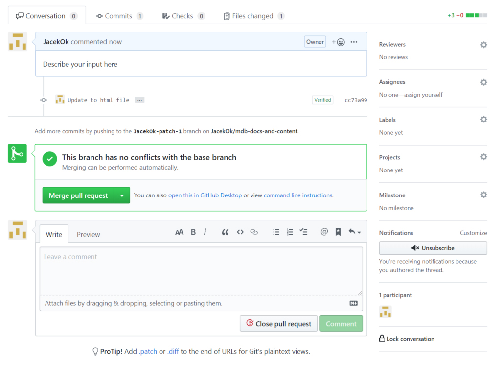 Press “Propose file change” button, and then “Create pull request” button, finally allowing us to admire your genius and after positive verification letting you to bask in well deserved glory as a top tier programmer and code visionary.