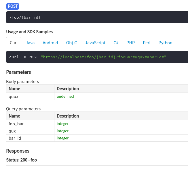 This issue exists in other language examples as well but I suppose that's due to the language conventions. On the other hand I don't know if the libraries will still make the right call. I suppose the staticaly typed ones as well could but languages like perl or python could just take the argument name as actual parameter. But then my assumption about conventions doesn't quite hold either as python is by convention snake_case but still generated example is using camelCase. We have to go deeper.