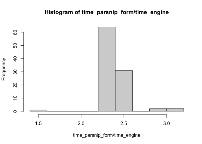 hist(time_parsnip_form / time_engine) hist(time_parsnip_xy / time_engine) Created on 2024-02-26 with reprex v2.1.0 |