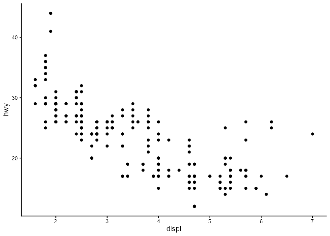 p <- ggplot(mpg, aes(displ, hwy)) +
