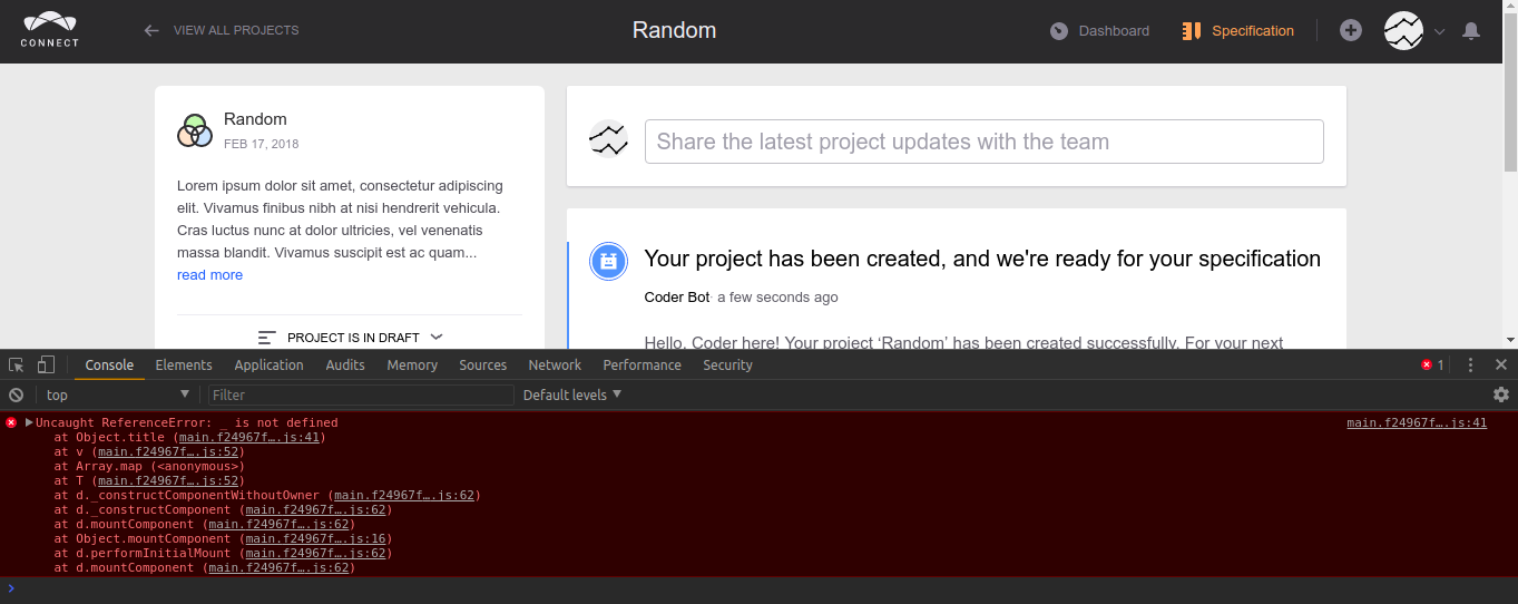 Uncaught ReferenceError: _ is not defined error is thrown and the ProjectSpecification component is not rendered