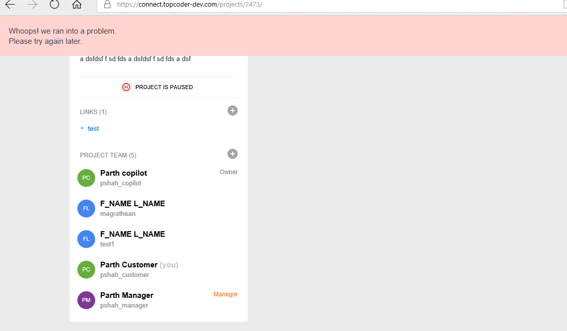 - Login to https://connect.topcoder-dev.com/ using pshah_customer/topcoder123