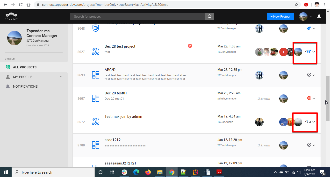 - Check the project names "Dec 28 test project" and "Test max join by admin"
