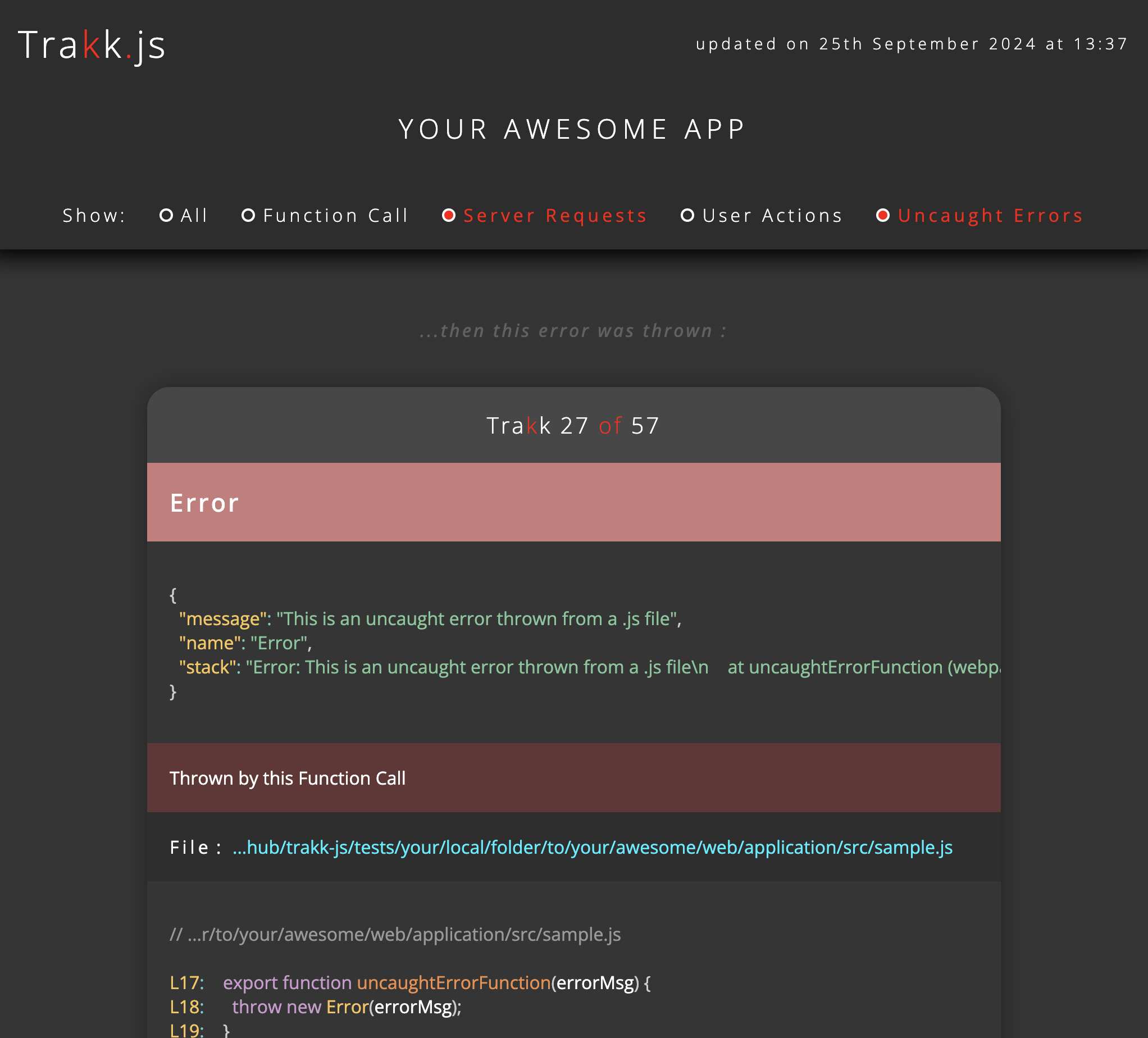 If your application throws unexpected errors that you are not catching, Trakk.js will present them to you with information about: