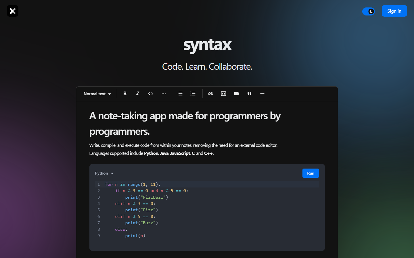 syntax is a multi-platform note-taking application designed specifically for programming students. In order to meet the needs of its target audience, the application supports writing, compiling, and executing code. It also contains many additional note-taking features, including searchable code snippets, drawing & stylus support, exportable notes, image upload, Youtube video embeds, and collaborative note creation.