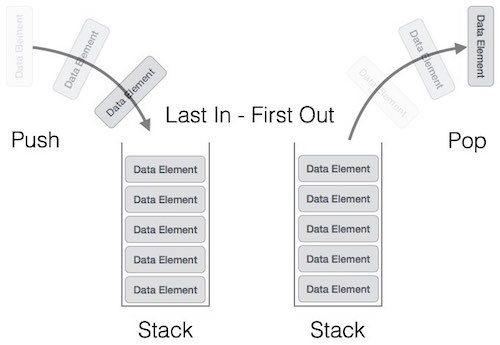 A linear data structure where all the insertion and deletion of data are only performed at one end. Stacks can be implemented by using linear arrays and carry the Last In-First Out principle as shown in the diagram below: