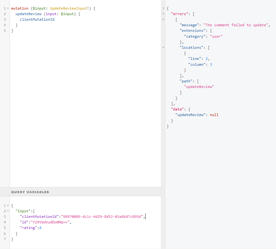 , GraphQL returns an error. (Error message: "The comment failed to update")
